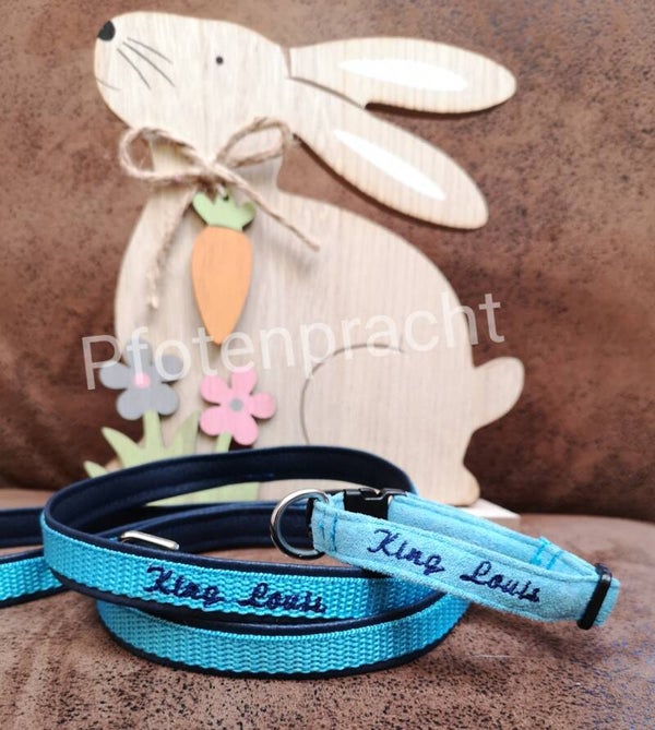 So individuell wie du selbst! Stelle dir dein eigenes Halsband zusammen. Jede Menge Auswahlmöglichkeiten zwischen Gurtbandfarbe, Stickfarbe und Kunstlederfarbe lassen dein Halsband zu einem echten Unikat werden.